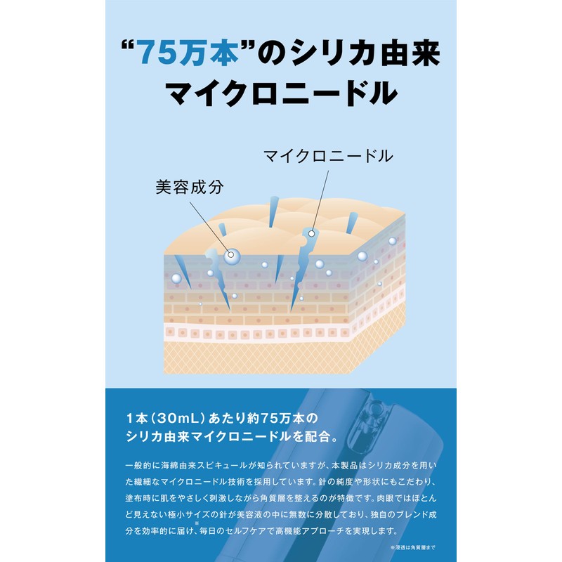 - ✅【約75万本※のシリカニードル配合】シリカ由来の微細なマイクロニードルを約75万本※配合。肌にやさしく塗布でき、角質層まで美容成分を届ける※独自処方を採用。※浸透は角質層まで/※1本(30mL)あたりの配合量目安です。