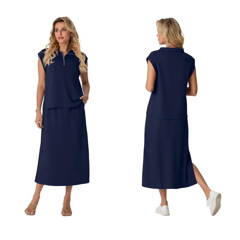 - Features: Skirt Sets Women 2 Piece Outfits;Half Zip Lapel Top /Cap Sleeves; Side Split Midi Skirt,Adjustable Elastic Waistband, Practical Pocket;Summer Casual Skirt Sets