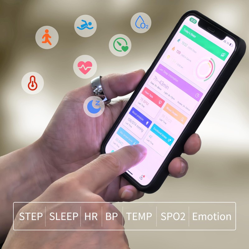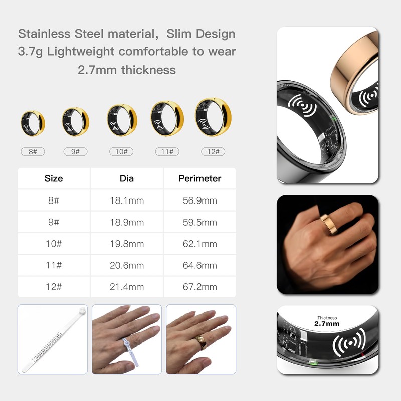 - ★Extensive Data: Sync your ring to the accompanying APP to access a wealth of health and activity metrics, set custom goals, and view progress over time for continuous improvement,Users can customize the detection frequency of the device according to their own situation, such as hours, days, or weeks.Can use APP to PowerOff your Ring when you don't need wear it for long time