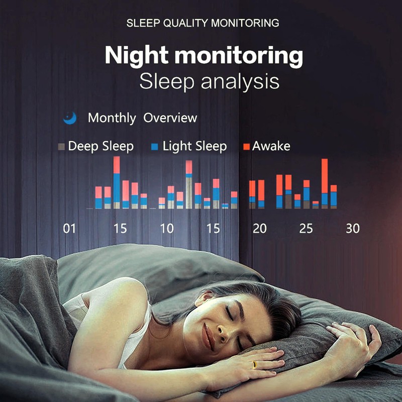 - ★Sleep quality monitoring:The Ring will analyze the collected sleep data and provide users with personalized sleep quality assessment reports,including deep sleep time, light sleep time, and REM sleep cycle,Based on the user's sleep data, the Ring will give targeted improvement suggestions,to help users improve sleep quality