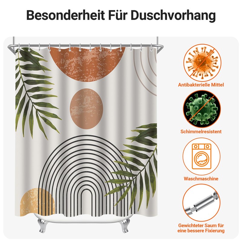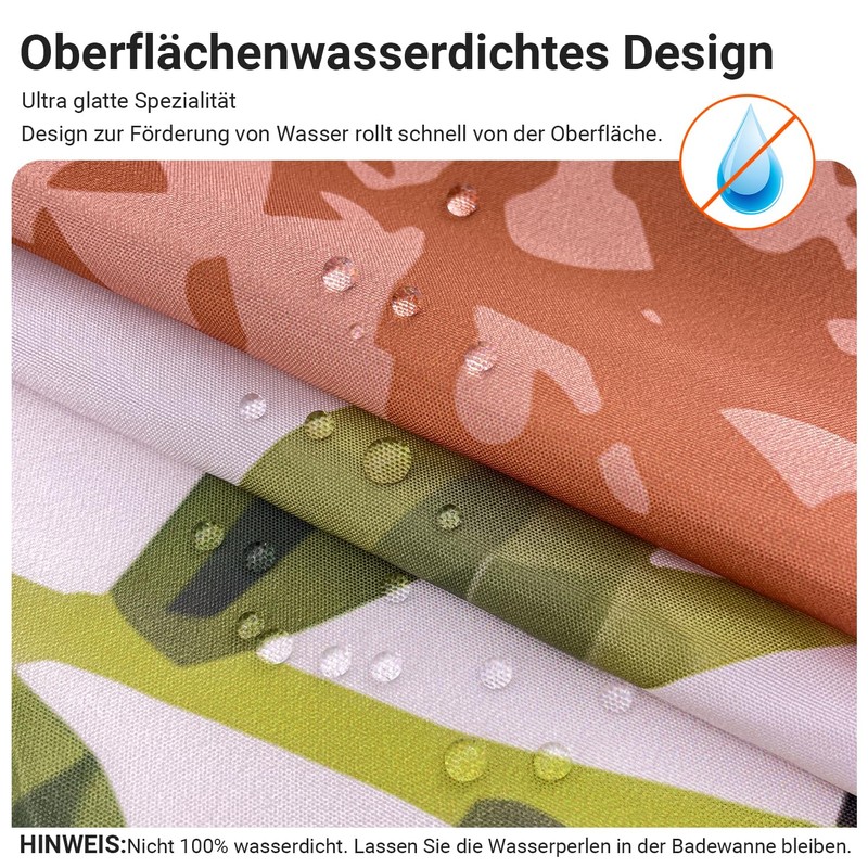 - Mould and waterproof coating: shower curtain surface use a waterproof treatment and antibacterial coating, water can easily bead off on the shower curtain, to prevent mould formation, make sure the water beads remain in the bath. Not 100% waterproof.