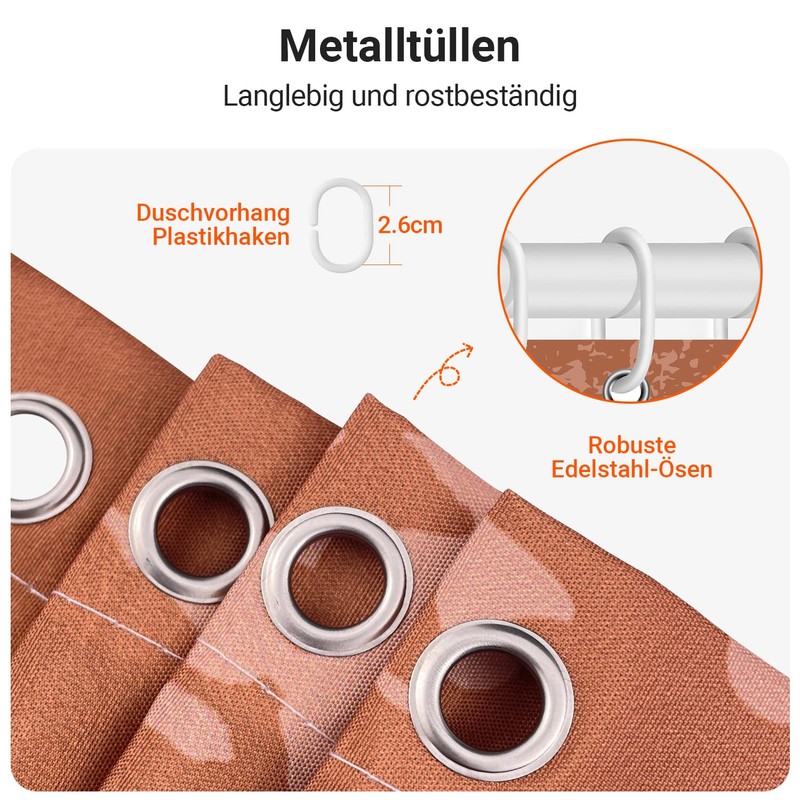 - EASY INSTALLATION This shower curtain is equipped with 12 plastic hooks, free hooks allows easy hanging of this bath curtain.Extra sewing with a secure weighted hem at the bottom. Bring the strong drop with you.
