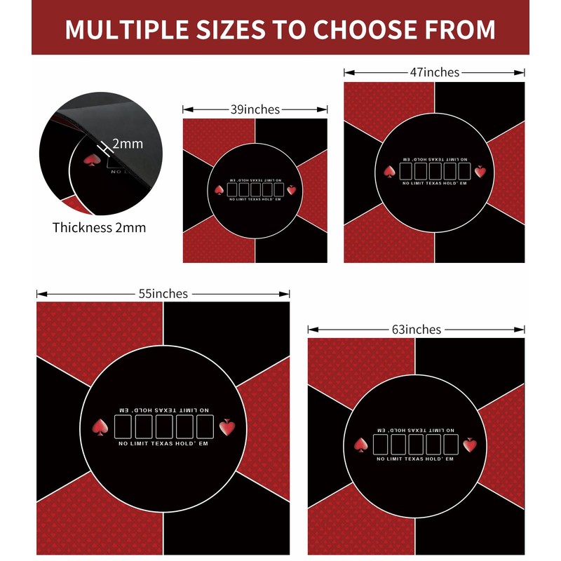 • Multi Size Square Poker Mats: Our round poker mat provides a non slip, quiet gaming surface. The size of the game table mat is 39/47/55/63 inches. There are multiple sizes to choose from, and the game table mat has a soft touch that can stay in place during the game. The 2mm thick game table mat can be easily folded up and can be immediately unfolded for gaming. The surface of the playing cards is printed with elegant patterns, adding a touch of elegance to your card game.