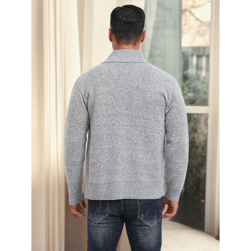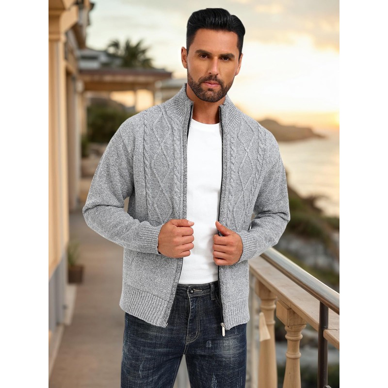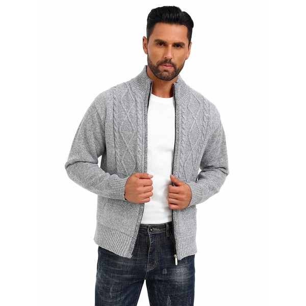 Les umes Men's Cardigan Stand-Up Collar Autumn Winter Fleece Jacket with Zip Regular Fit Knitted Cardigan, lightgrey