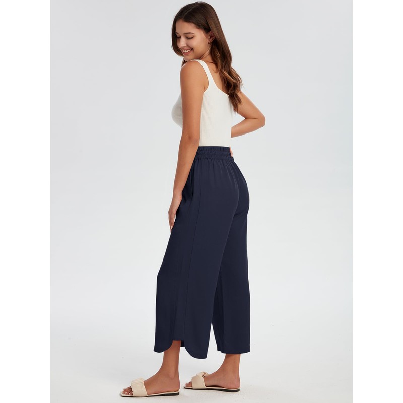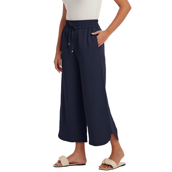 Les umes Womens Linen Wide Leg Cropped Pants High Elastic Waist with Drawstring Casual Summer Ankle Trousers Navy Blue M
