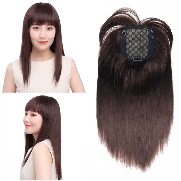 LesafeV Silk Base 16 inch Synthetic Topper with Neat Bangs 10x10cm Middle Part Head Top Hairpiece Straight Clip in Closure Toupee (4# Black Brown)