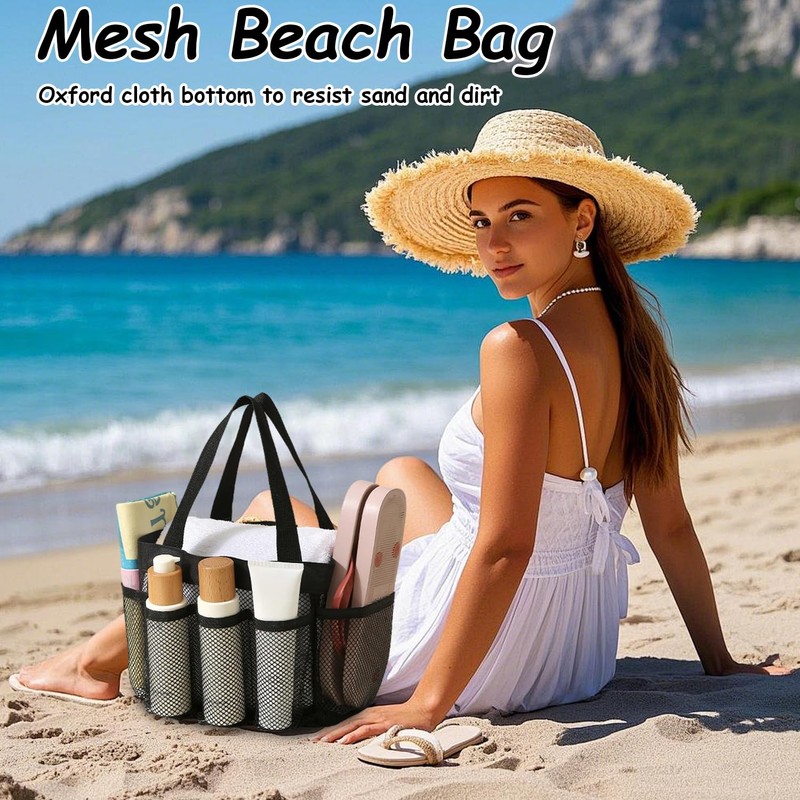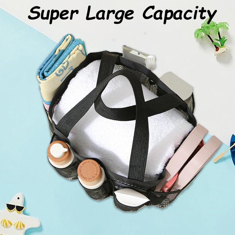 Leseogye Mesh Shower Bag, Portable Mesh Shower Caddy Bag with 7 Pockets, Foldable Quick Dry Beach Bags for College Dorm, Swimming, Gym, Beach, Travel (Black)