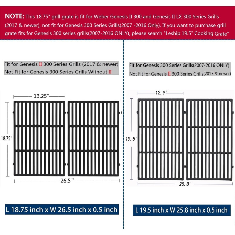 - Please note it fits: The weber grill grates genesis ii fits genesis ii 300 series grill, Grill panel shown as GENESIS II (model years 2017-current).NOT FITSWeber genesis replacement parts not fits grill panel shown only GENESIS without II (model years 2007-2016). If you can't confirm if it matches your grill, please E-MAIL us or post a question. weber genesis ii gs4 grates, weber genesis ii e310 grill parts, weber genesis ii grates gs4.