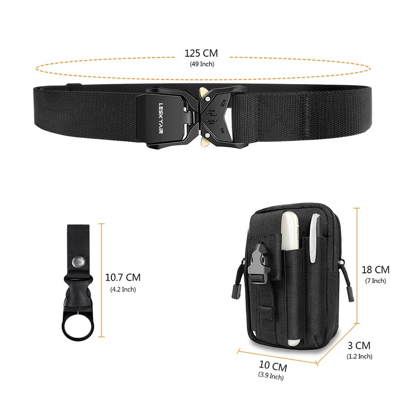 Leskyair Men's Tactical Work Belt, High Performance, 38 mm width, Military Style, Quick Release Metal Buckle, Gift with Tactical Molle Bag and Water Bottle Clip, A-Black, Einheitsgröße