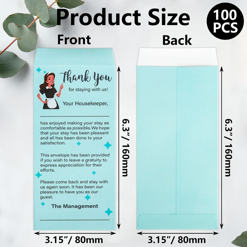 - 【Wide Application】These housekeeping thank you tip envelopes are suitable for hotel,motel,apartments,inn,resorts and more,not only for storing thank you tips for housekeeping staff,maids and cleaners,but also for banknotes,checks,stamps,gift cards,jewelry and trinkets and so on.Greatly increasing the chances of getting housekeeping tips.