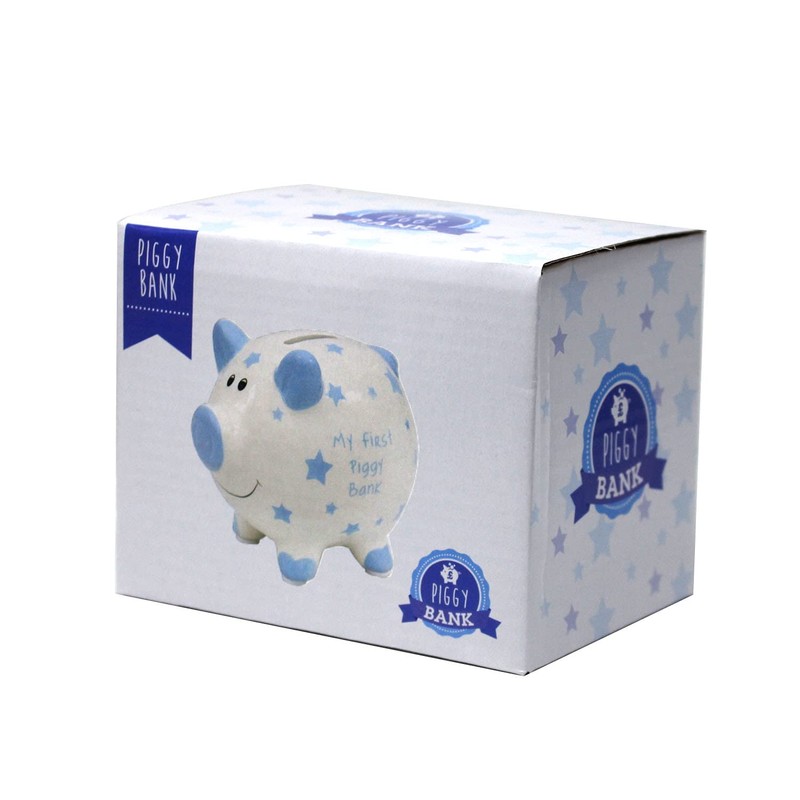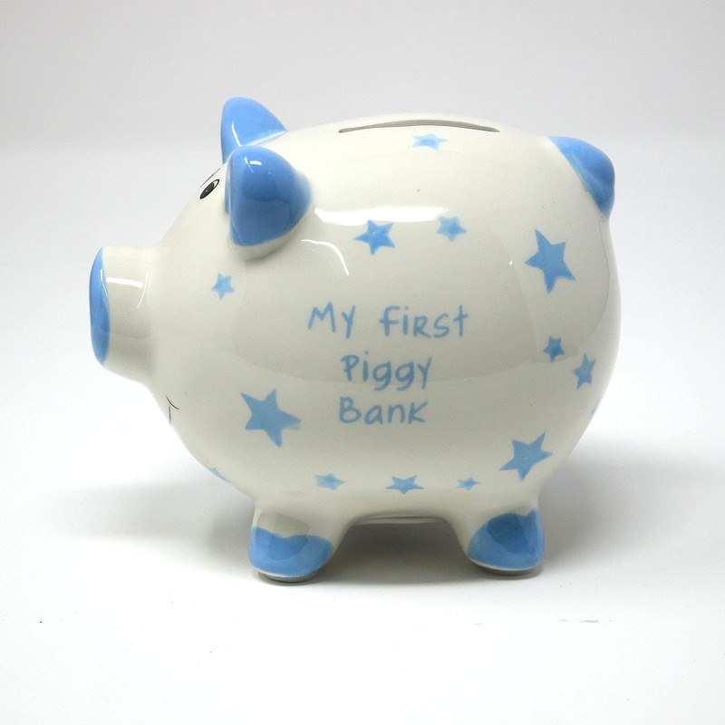 • CUTE DESIGN: Teach your kids how to save money with this cute coin bank that features a glossy white ceramic pig covered with baby blue stars and a text that says "My first Piggy Bank".