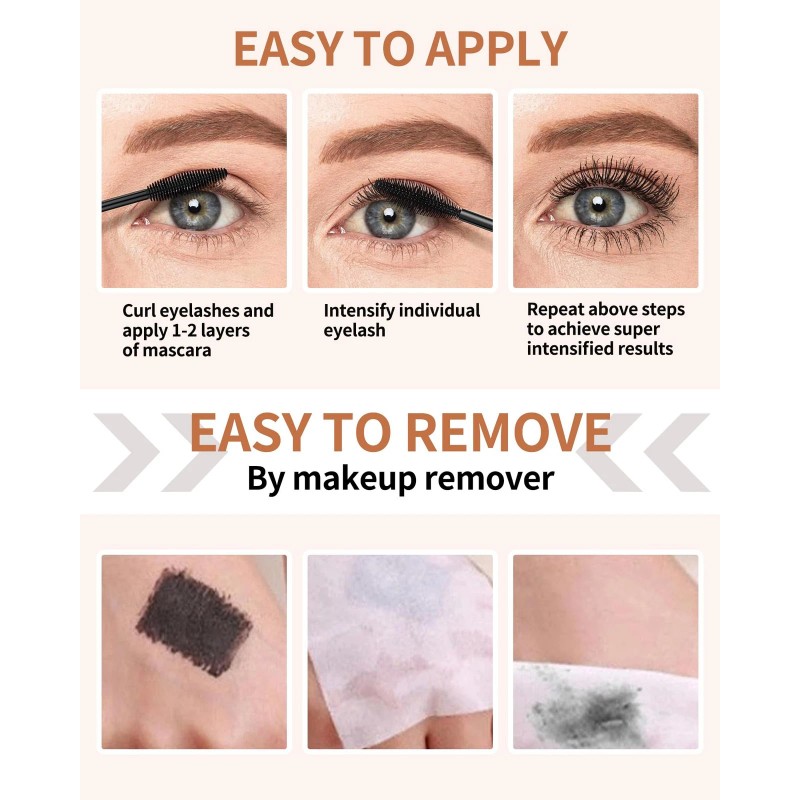 Easy To Remove - Our eye mascara is light and goes on smooth without clumps, keeps your eyes and lashes comfortable and natural all day and night. Our unique formula will rinse off each lash, leaving behind no mascara streaks or black stains on your towels! Easy to remove with a makeup remover or warm water without damaging your lashes.