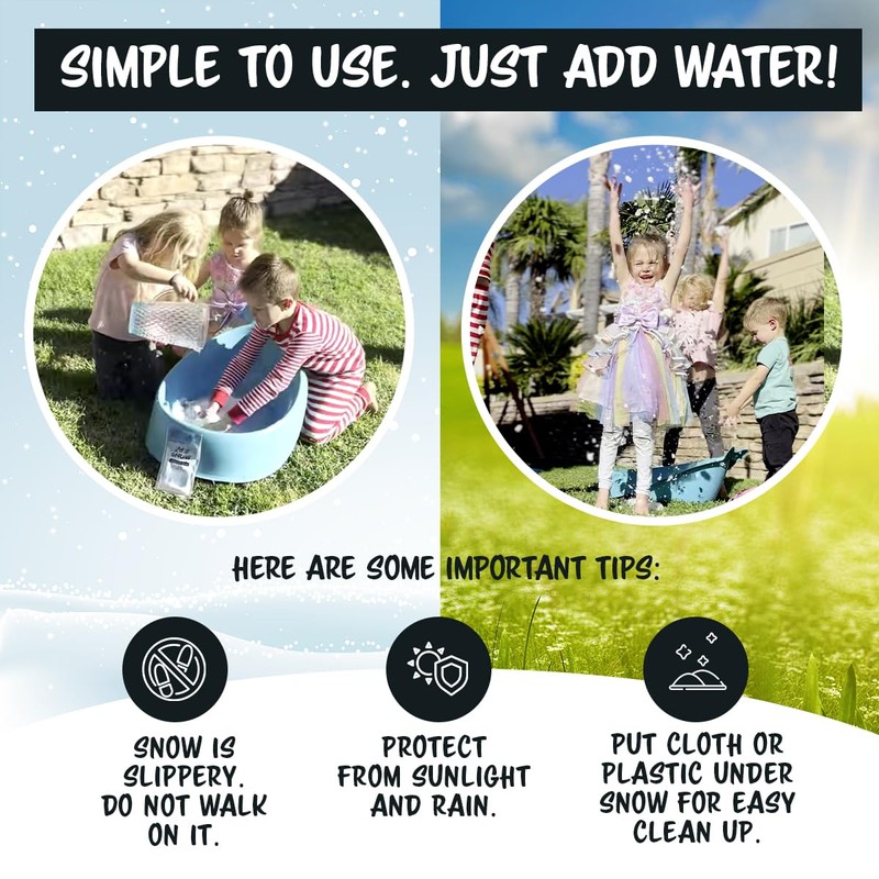 - Easy To Use: Just add water and watch it erupt into snow in seconds! No stirring or mixing is required for our fake snow craft. Easy-to-follow instructions are included. Watch as your artificial snow mix grows 100 times its size!