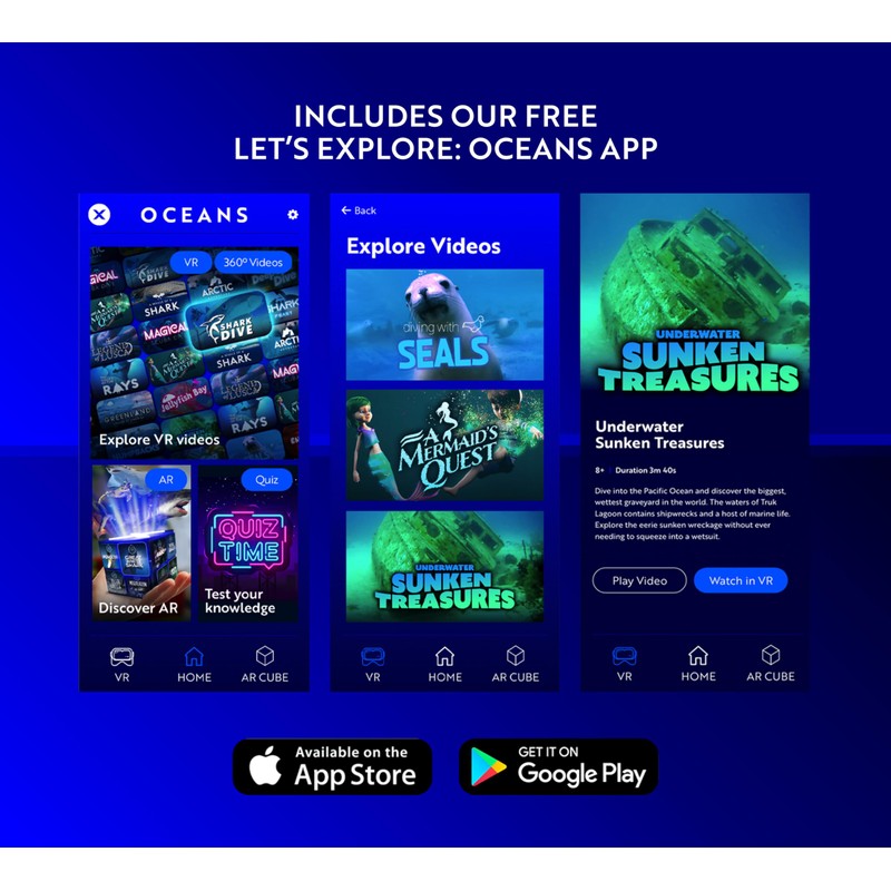 - EXPLORE, DISCOVER & LEARN WITH LET'S EXPLORE OCEANS: Fully Immersive, 360 Degree, Virtual Reality, Educational Experience Headset. For Kids and Adults of all ages. Everything you need to explore the oceans without leaving your room. Pack also includes a Magical Holographic Cube, watch it come to life in your hands with amazing Augmented Reality. Pack also includes Full Colour fact book, Sticker Book, Giant Poster, and Shark Model.