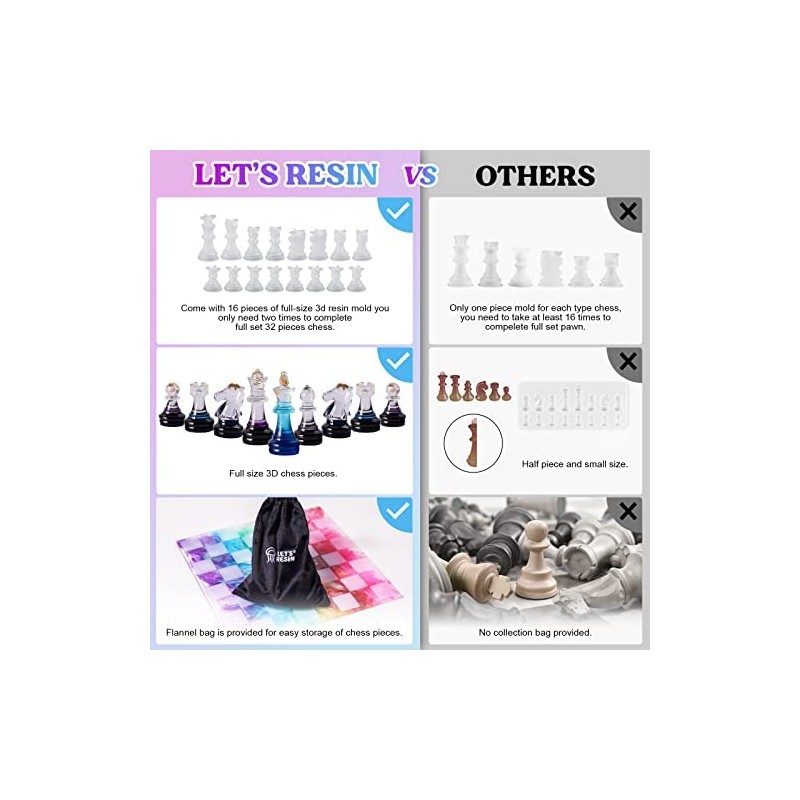 - 【Upgrade 3D Resin Epoxy Molds】 The Latest 3D chess silicone molds for resin are full size and are formed at one time without bonding, allowing you to get the perfect chess pieces and a full set of 32 pieces can be completed in just two times. It also comes with a storage bag for easy storage and carrying.