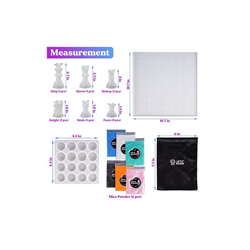 - 【Total 25pcs Chess Resin Molds Set】:Package including chess board resin molds x 1, checker piece resin molds x 1, king molds x 1,queen molds x 1, rook molds x 1, knight molds x 1, pawn molds x 8; mica powders x 6, storage bag x 1; The storage bag will keep chess pieces neatly stored when not in use.