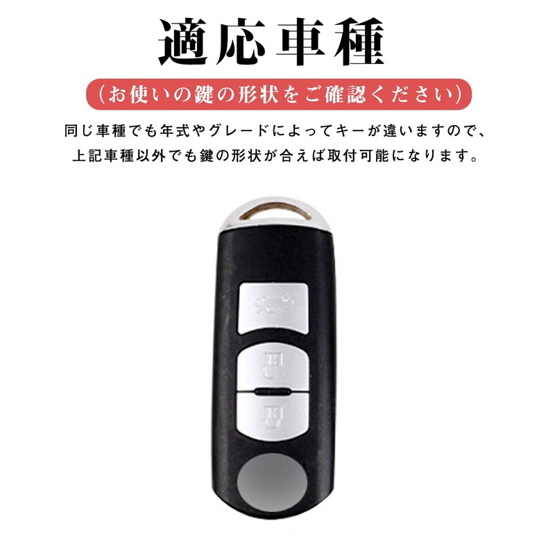 - Compatible models: MAZDA CX-5 CX-3 CX-8 MPV Axela Sport Axela Sedan Atenza Sedan Atenza Sedan Atenza Wagon Demio Biante Primacy Beresa Roadster All Grade Advanced Key Compatible (Please check the shape of your key) *If the key is not listed above, it can be installed if the key shape matches the shape of the car model. Please make sure you match the picture of the compatible key model before purchasing