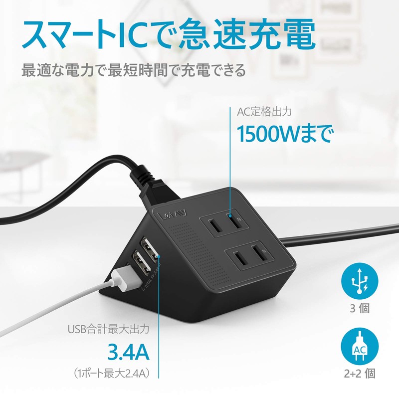 Letmy AS-2312 USB Power Tap, Extension Cord, 4.9 ft (1.5 m), 4 AC Outlets, 3 USB Ports, Outlets, Branching, Table Tap, Fast Charging, 1,500 W, Overload Protection, Small, Compatible with Calluses
