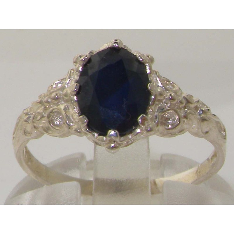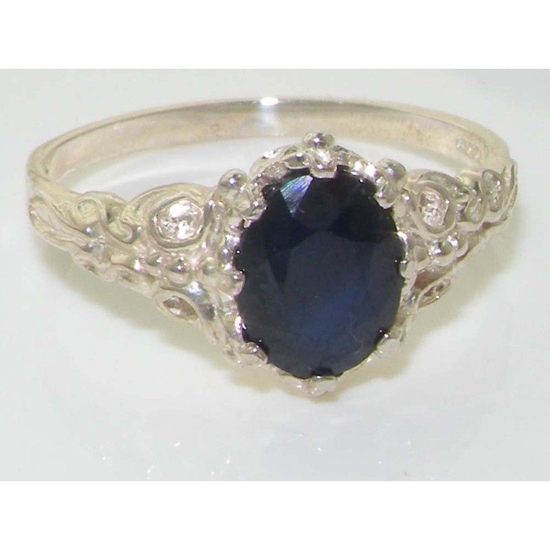 This stunning ring has been set with a solitaire Fabulous colorful Sapphire measuring 8x6mm (0.32" x 0.24" inches) which has a nice dark midnight blue color and looks so elegant set against the Sterling Silver. The Sapphire has been hand set in this luxury Solid Sterling Silver Solitaire setting with a beautiful English Carving on the shoulders of the ring.