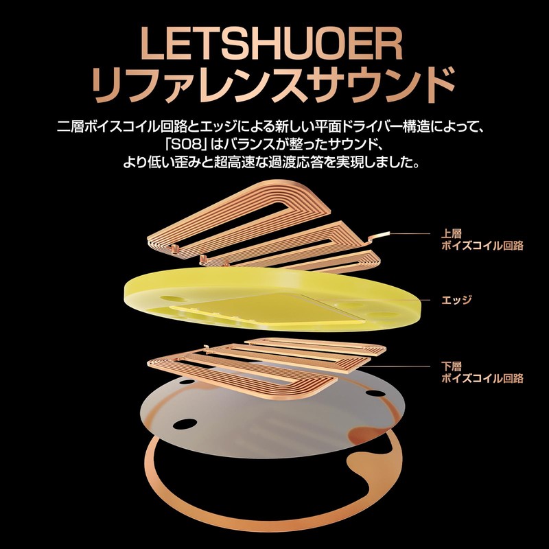 - [4th Generation Custom 0.5 inch (13 mm) Flat Drive Driver] The S08 is equipped with a custom 4th generation 0.5 inch (13 mm) flat drive driver developed in collaboration with LETSHUOER. Due to precision manufacturing technology and new structure of the driver, the flat driver adopted "S08" greatly increases stability and achieves lower distortion and ultra-fast transient response