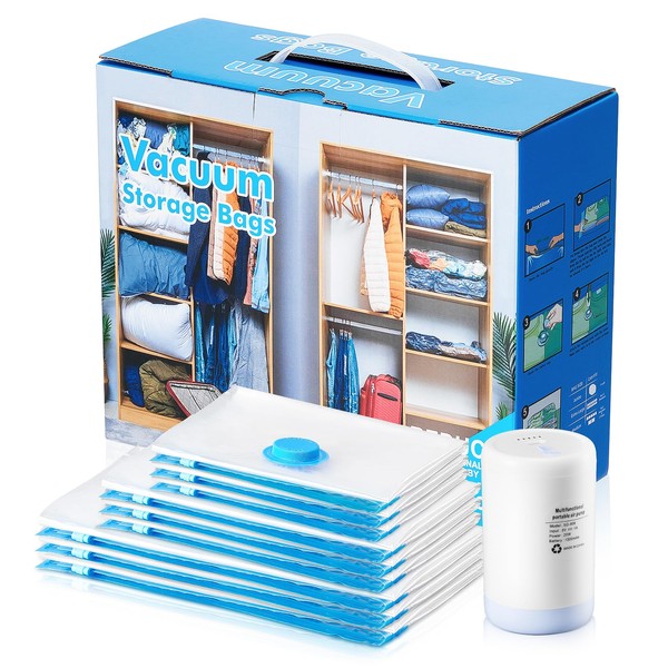 - USB ELECTRIC PUMP PROVIDED: The convenient USB electric pump with 1500mAh battery capacity, makes vacuum storage bags a breeze. Whether you're in a dorm room, at an airport, or staying in a hotel, you can easily compress your vacuum bags, promptly making the most of your storage space.