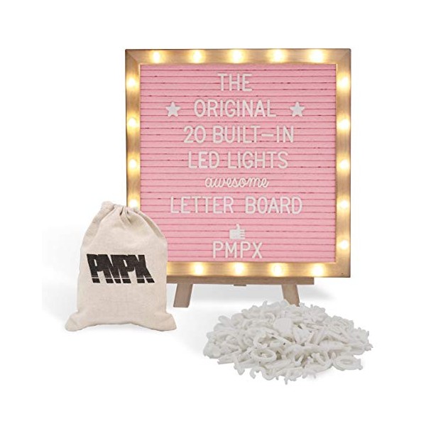Letter Board THE ORIGINAL Pink Felt Board with Stand, Built-in LED Lights 10 x 10 -Menu Board + Wood Frame, 340 Letters, Emojis + Cursive words - Custom Sign Messages, Pregnancy Announcement, Weddings