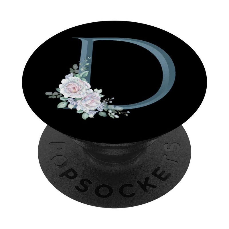 - A beautiful two tone letter D initial with light and dark teal blue colors with a pretty watercolor flower bouquet in light pastel shades of pink and green on a black background.