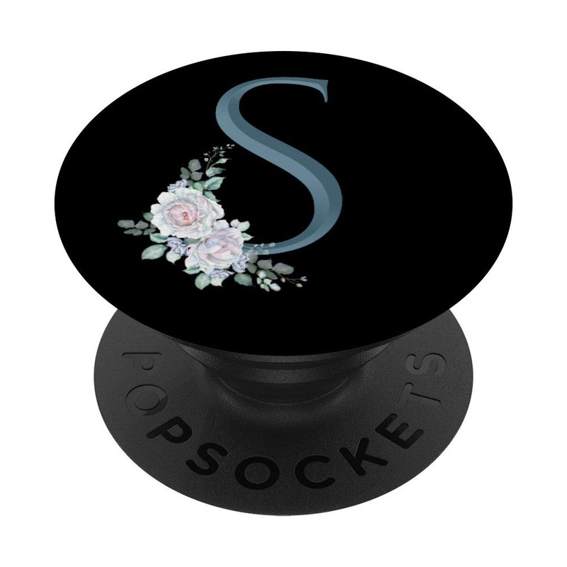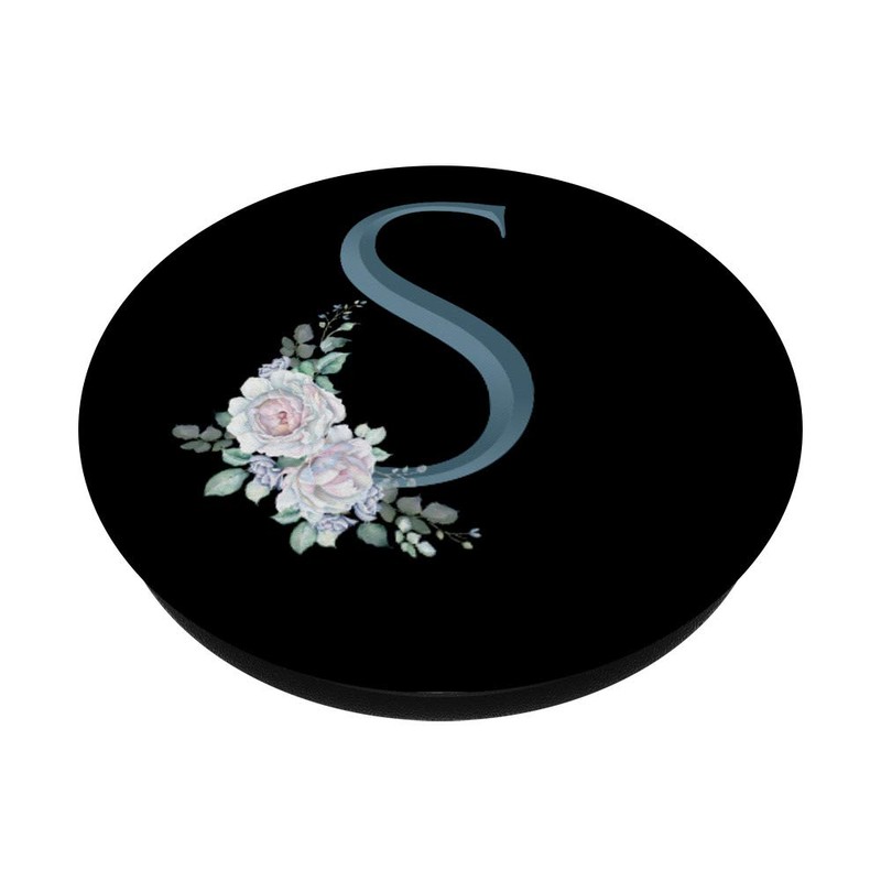 - A beautiful two tone letter S initial with light and dark teal blue colors with a pretty watercolor flower bouquet in light pastel shades of pink and green on a black background.