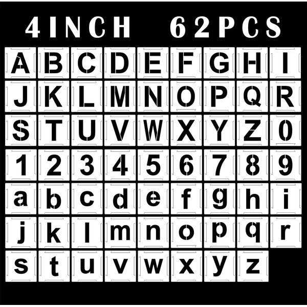 • 【Package Includes】: The kit includes 26 pcs uppercase letter stencils, 26 pcs lowercase letter stencils and 10 pcs number stencils templates. A-Z /a-z/ 0-9 stencil in Arial font. Stencil received will be as exactly as shown in the main listing photo.