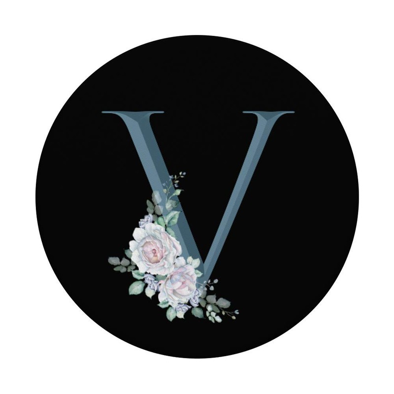 - A beautiful two tone letter V initial with light and dark teal blue colors with a pretty watercolor flower bouquet in light pastel shades of pink and green on a black background.