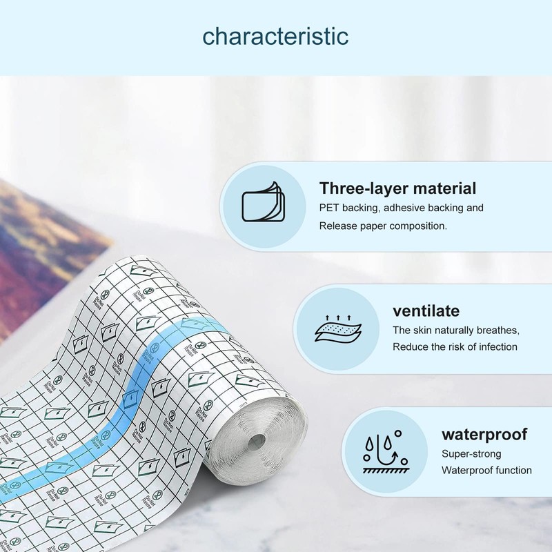 - ????3-Lagen-Design??oWasserdichte transparente Bandage Folie hat eine hohe Dehnbarkeit und Dehnbarkeit, so dass sie sich gut an die K?rperkonturen anpassen kann. Das Verbandprodukt besteht aus 3 Schichten, die erste Schicht wird abgeschabt und die zweite Schicht wird auf die Hautoberfl?che aufgetragen. Anschlie?end wird die oberste Schicht abgerissen.