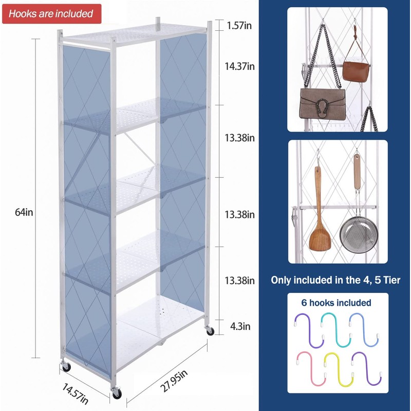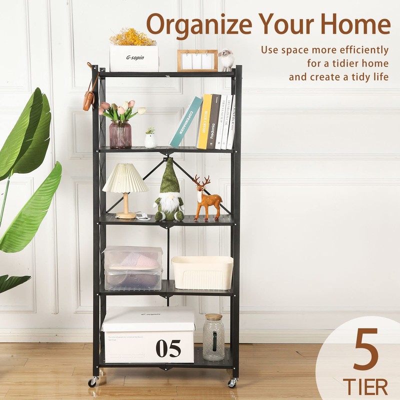Letusto Foldable Collapsible Shelf with Wheels & Breaks - Folding Shelf Heavy Duty Metal Frame Pantry Shelving Unit - Origami Bookcase - No Assembly Bookshelf (Black, 5 Tier)