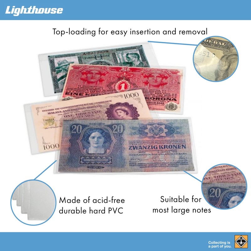 - Lighthouse Pack of 50 BASIC Clear Banknote Sleeves 341222 - 210 x 127 mm (204 x 123mm)