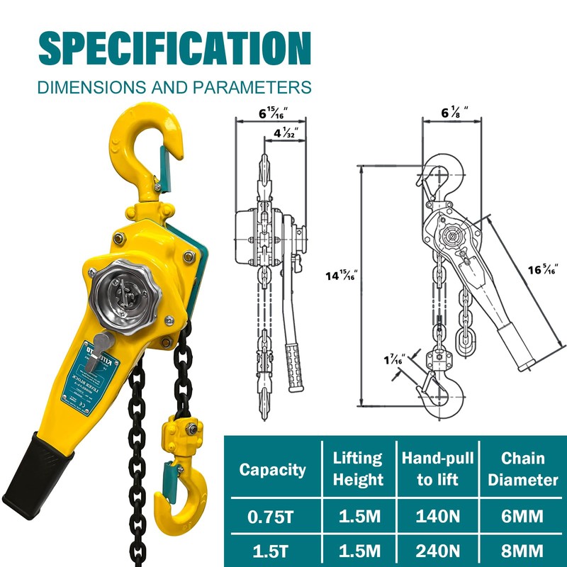 - 🔥【HIGH-QUALITY CHAIN HOIST】The lever chain hoist is made of solid carbon steel, and has excellent impact resistance and oxidation resistance; Lifting capacity is 1650 lbs and 3/4 tons, and the chain length is 10ft.Our Chain Come Along can handle the toughest tasks with ease.