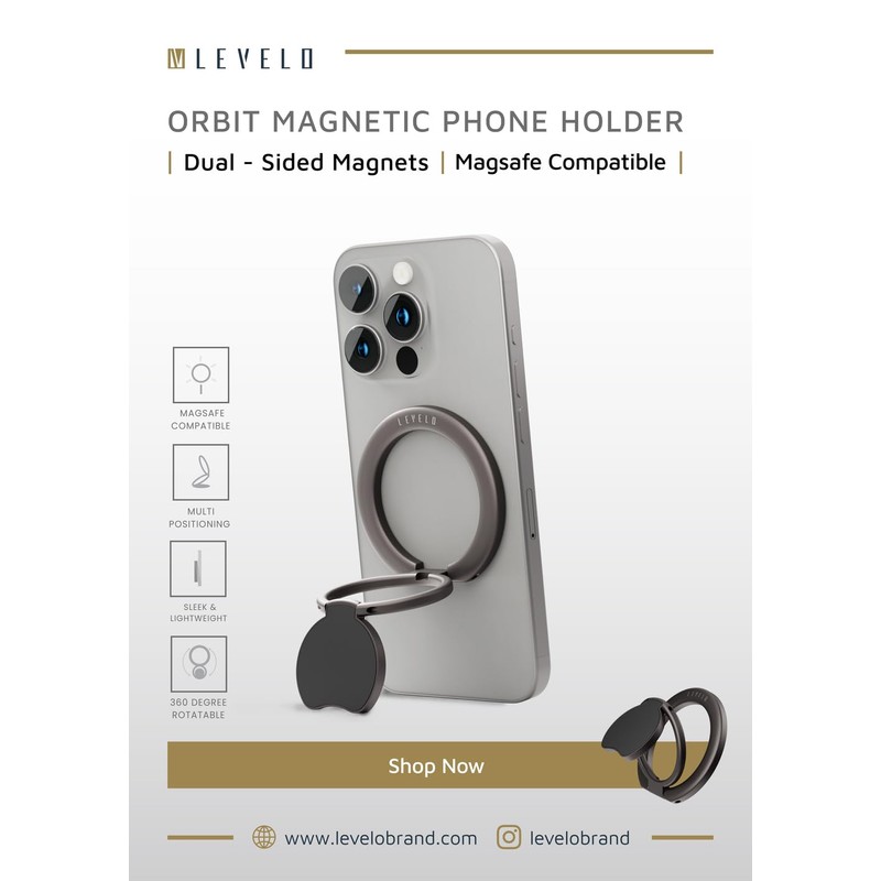 The Levelo Orbit Compatible with MagSafeMagnetic Phone Ring Holder is designed for ultimate convenience and functionality. Featuring a 360ยฐ rotatable design, it allows multi-positioning for hands-free viewing and optimal grip. Its sleek and lightweight design ensures that it complements your device without adding bulk. With its strong magnetic compatibility, it attaches securely to Magfit-enabled devices, providing enhanced security and ease of use throughout the day.