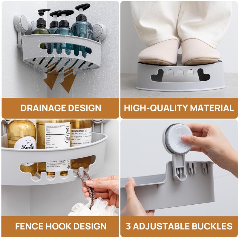 - Drainage Bottom & Adjustable Buckle Design: Shower caddy corner with drainage bottom keeps things like shampoo, shower gel, conditioner and facial cleanser air dry quickly and clean. With a rear adjustable buckle to avoid ceramic tile gap. The suction cup shower caddy keeps every corner tidy
