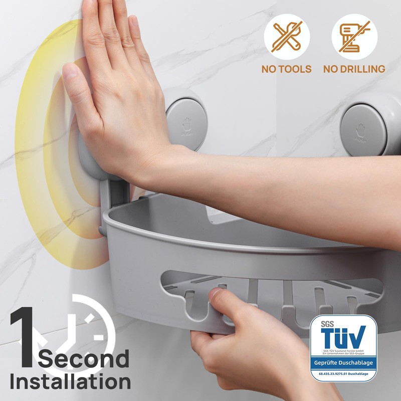 LEVERLOC Corner Shower Caddy Suction Cup, Powerful Suction Bathroom Shower Shelf, Waterproof and Rustproof Organizer for Bathroom Storage and Kitchen, No-Drilling Removable, Grey