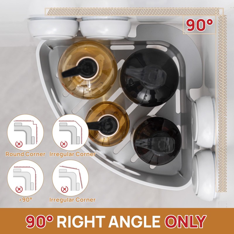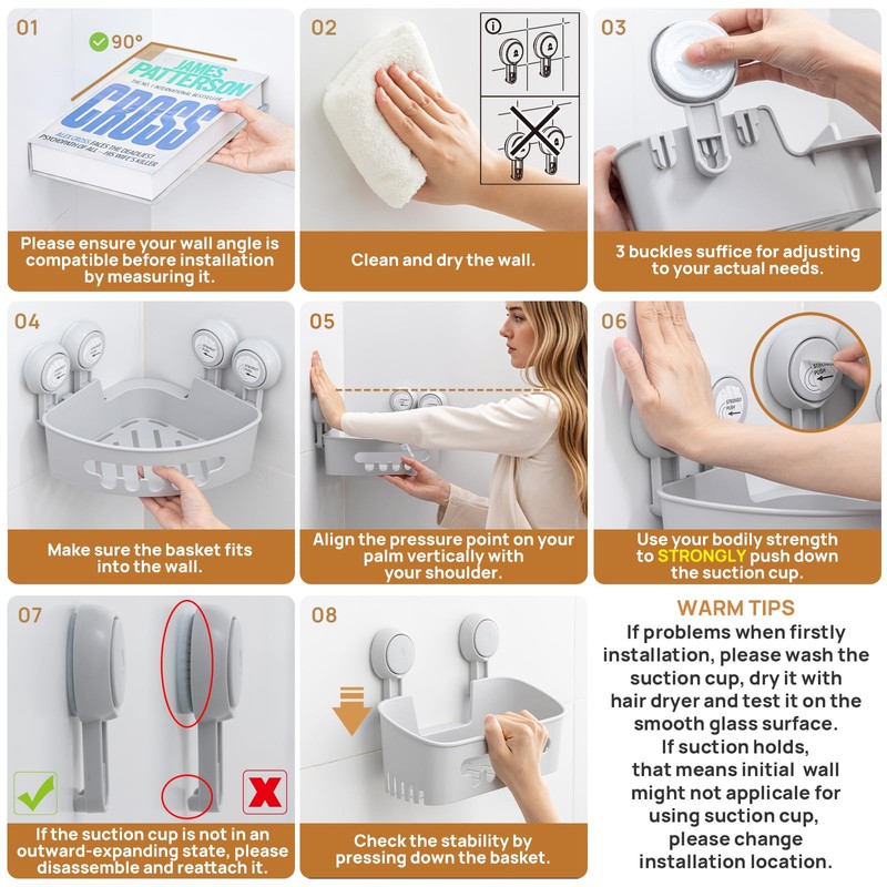- Warm Tips: Please remember not to stick this suction cup corner shower caddy to the grout lines. This shower caddy only fits for standard 90° right angle corner. This powerful corner shower caddy works best on non-porous, impermeable, smooth surfaces such as glass, mirror, polished metal, stainless steel, plastic board, wall tile, grainy granite, etc. If you experience any problems during initial installation, please wash the suction cup, dry it with a hairdryer and test it on a smooth glass surface. If the suction holds, it means the original wall may not be suitable for using the suction cup, please change the installation location