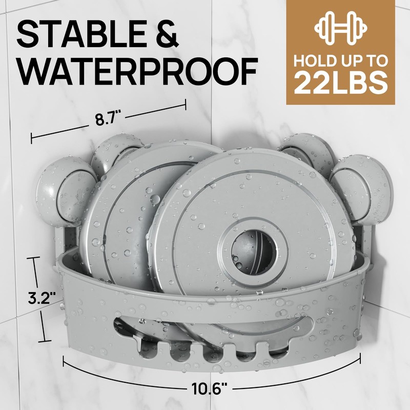 - Powerful & Durable: Made of reliable quality material, shower caddy suction cup heavy duty can hold up to 22 lbs and stick sturdy for years after installation without any worries. The dimension of this shower caddy is 10.6 * 8.7 * 3.2 inch(L*W*H)