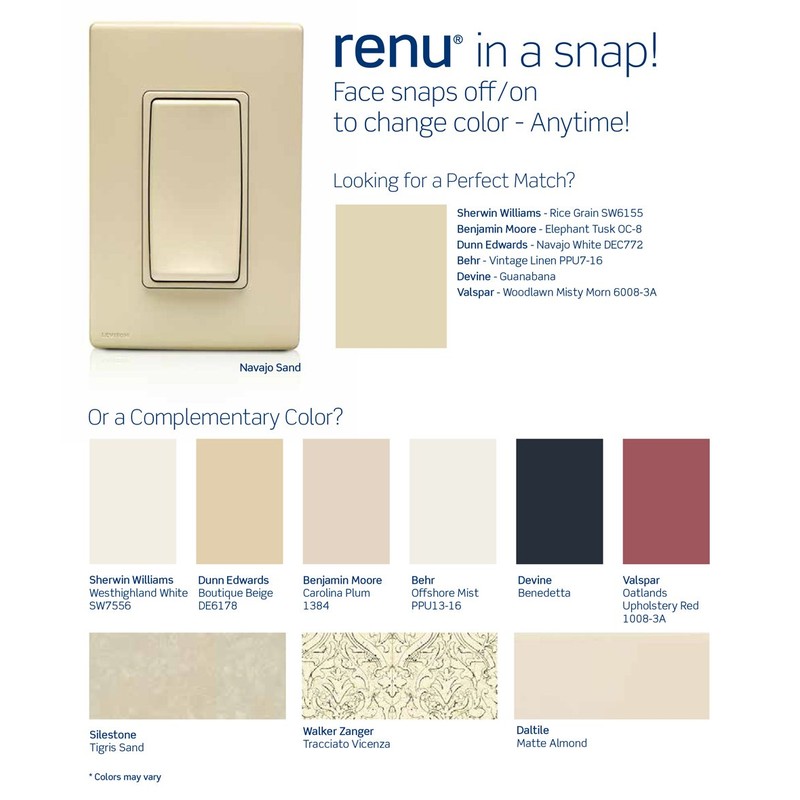 Renu in a Snap! Renu is the smart new line of decorative electrical products from Leviton. Install Renu and get a fresh stylish look, plus the ability to change the color of any Renu device when you update a room. The line includes switches, outlets, GFCIs, dimmers, and sleek, screwless wallplates available in 20 designer colors. Renu REWP2 2-gang wallplates, slightly larger than standard ones, cover wall imperfections and snap directly onto the devices for a perfect finishing touch. They are designed for Renu devices only, with the following Decora exception. A Renu adaptor ring REA00, sold separately in White on White (decora White), Navajo Sand (decora Light Almond) and Onyx Black (decora Black) only, allows any Decora device to fit into a Renu wallplate.