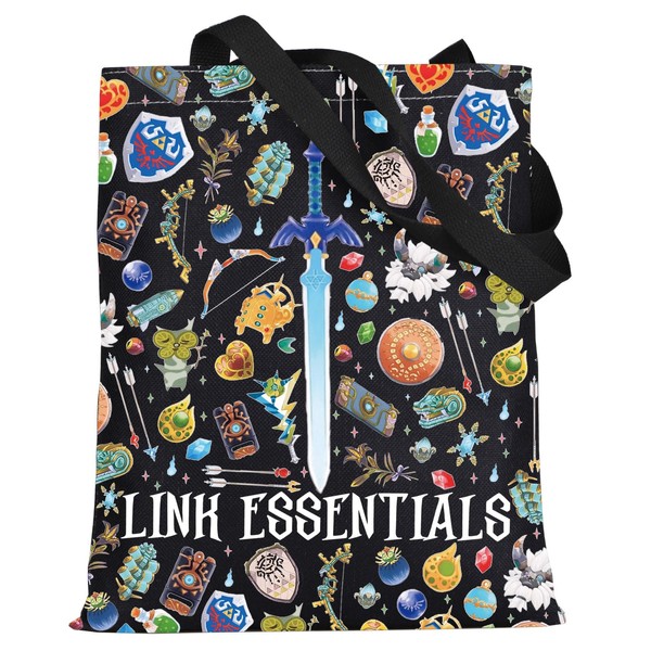 LEVLO Cartoon Game Canvas Tote Bag Cartoon Game Fans Gift Link Essentials Game Shoulder Bag Gamers Merchandise, Link Black Tote, Medium
