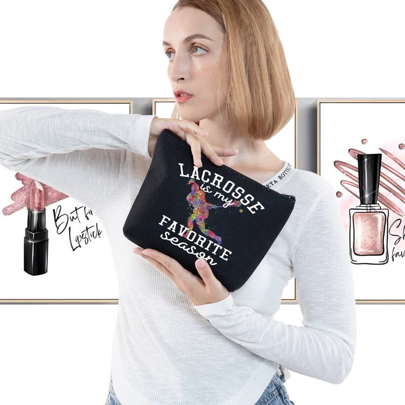 LEVLO Lacrosse Girl Cosmetic Make Up Bag Gift For Lacrosse Player Lacrosse Is My Favorite Season Make Up Zipper Pouch Bag For Lacrosse Lover, Lacrosse Season Black, Cosmetic Bag