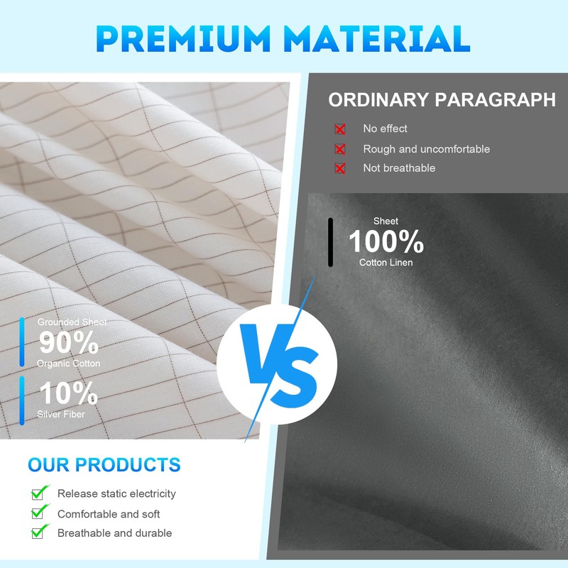 - PREMIUM MATERIAL: The grounding bed sheets are crafted from a blend of 90% organic cotton and 10% silver fiber. High-density cotton is not only soft and breathable, but also smooth and luxurious. 10% silver fiber is highly conductive and durable. The earthing sheets allow you to find a balance between comfort and health.