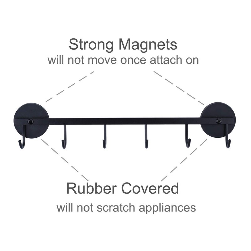 - Package includes 1 magnetic utensil holder with 6 hooks, which securely holds light utensils or heavy utensils in place.