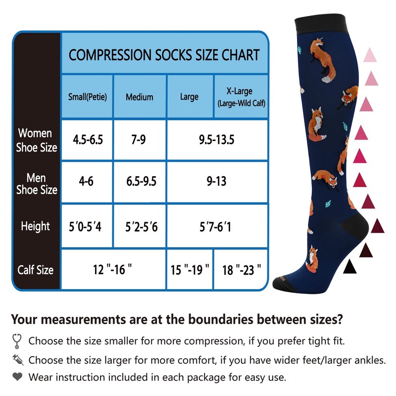- COMPRESSION SOCKS 20-30 mmHg. A Durable Compression Socks have wide variety of fun colors and designs specially for nurses, size rang cover both women and men. Double stitched with functional Fabric and knitted with seamless compression technology. Fits comfortable, easy to get on and delivers 360° support to feet and legs. Knee high long sleeves compression socks make sure the graduated support effect entire calf.