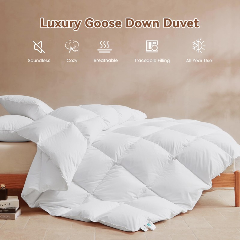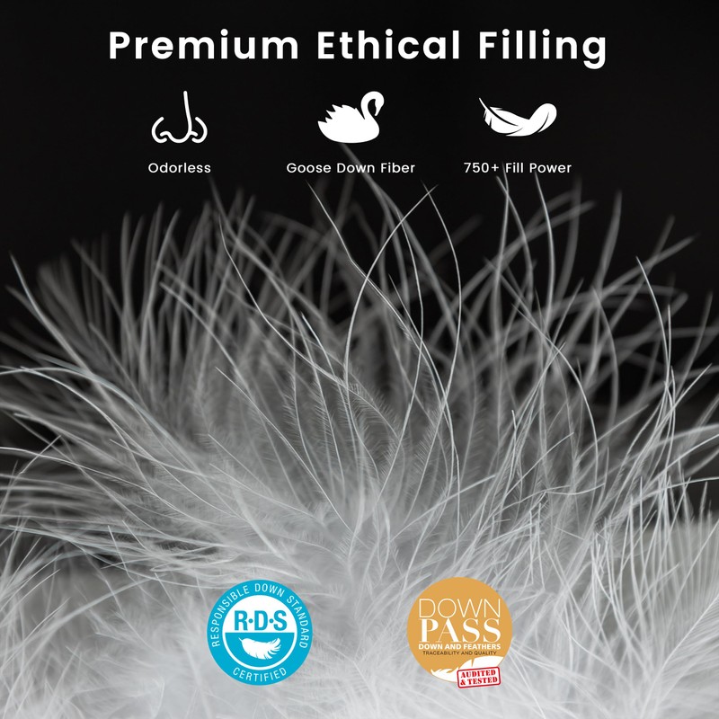 - 【Certified Filling】We comply with Responsible Down Standard(RDS) to harvest filling. Responsibly-harvested goose down fibers and feather fibers fillings are filled in the duvet. Odorless 750+ fill power provides you a hotel quality goose feather down comforter. Thermal insulation filling ensues a fluffy comforter.
