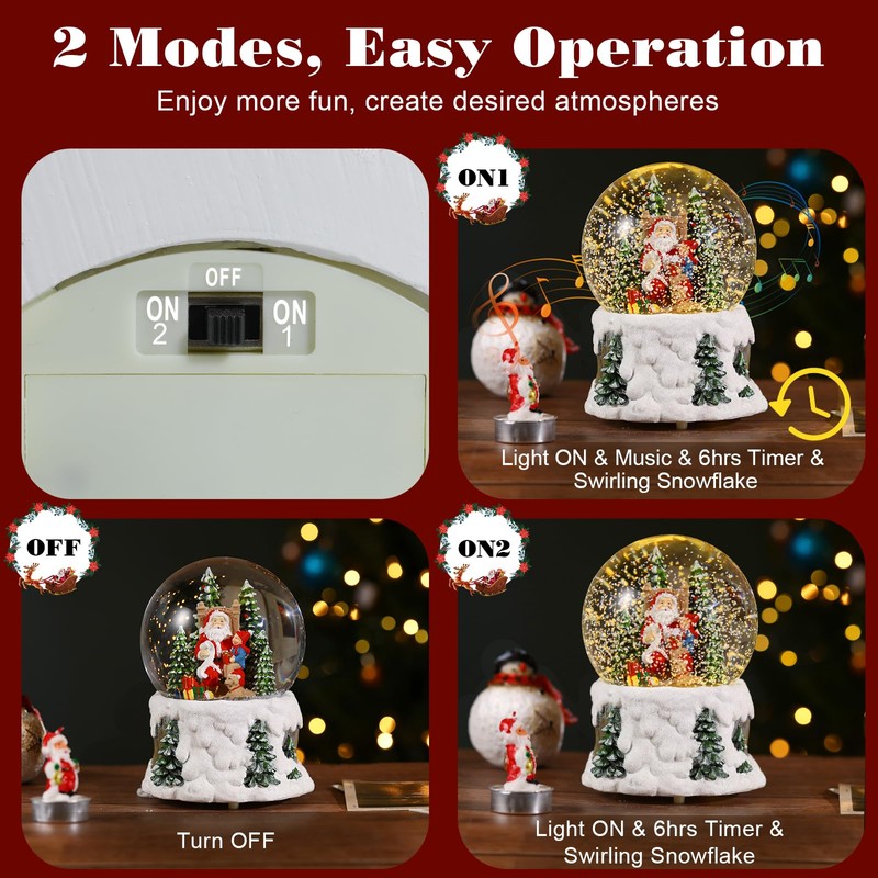 - 【Multi-functional Switch】With the "ON1-OFF-ON2" switch at the bottom of musical snow globe for easy control and use. (1) When switching to ON1, enjoy the romantic lights, floating snowflakes and 8 cheerful Christmas songs. (2) When switching to ON2, only turn on the light and snowflake function. (3) Switch to OFF to turn off the light.