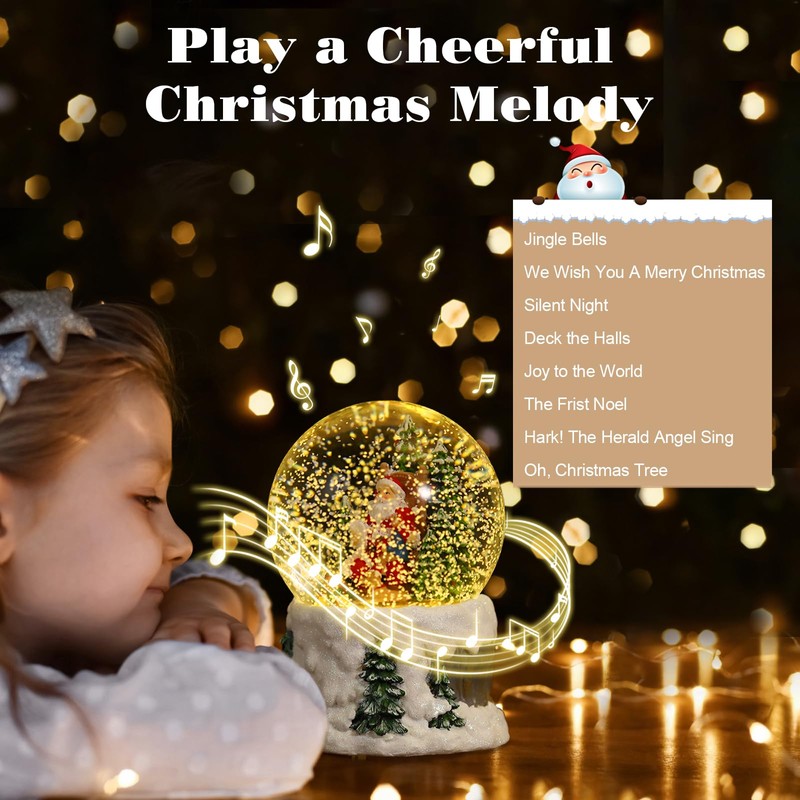 - 【Santa Claus Christmas Snow Globe】The electric snow globe collects all the romantic Christmas elements to create a Christmas wonderland. With pleasant Christmas songs, lights up as well as snowflakes slowly falling, Santa Claus is sending a gift to the child with a long gift list in hand, surrounded by a cute dog and a classic Christmas tree. Rich details and vibrant colors make you immerse in the romantic atmosphere.