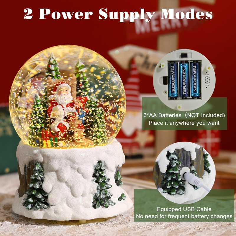 - 【Batteries/ USB Powered】The Christmas water globe comes with 2 power supply methods, meeting your different needs. (1) Powered by 3*AA batteries (NOT Included), convenient to move to any place for decoration. (2) Or operated by the equipped USB cable, no need to replace batteries frequently and easy to recharge for recycling use.