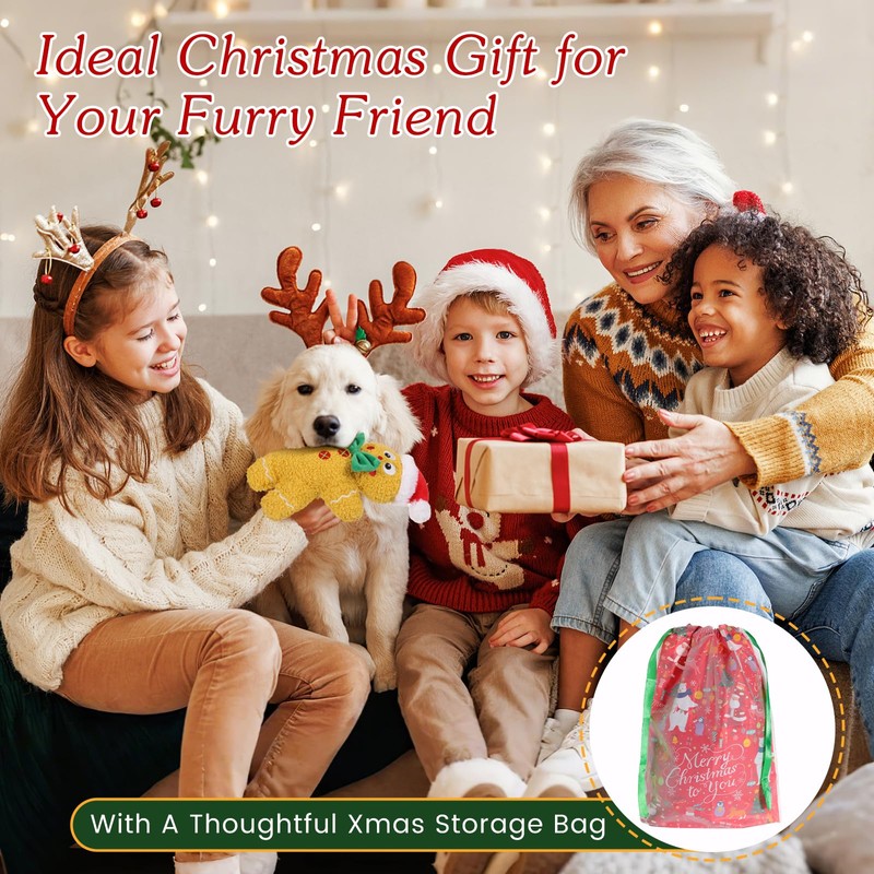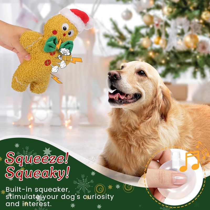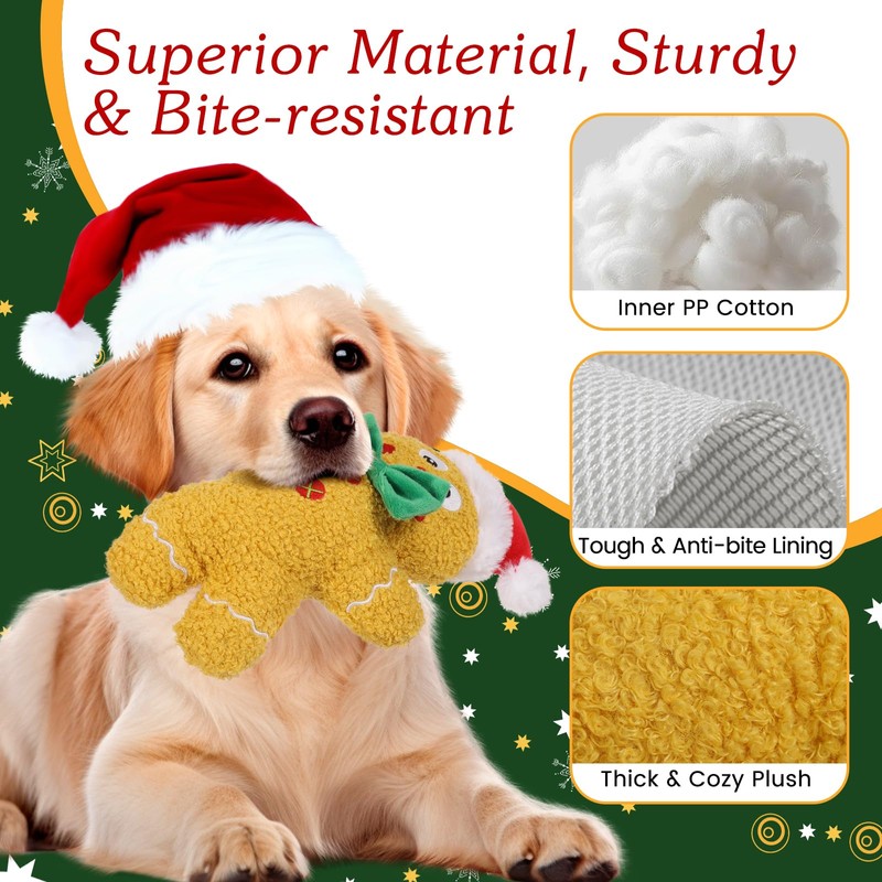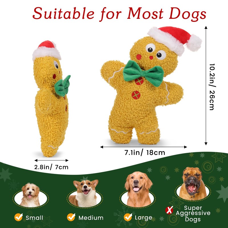- 【Cute Gingerbread Man Plush Toy】Find a playmate for your dogs at home alone! Our squeaky dog toy features a lovely Gingerbread shape in bright colors and Christmas style, easy to win their love. It can not only effectively relieve your furry friend's negative emotions, no longer feel boredom and anxiety, but also help puppies grind and clean their teeth. Suitable for small and medium dogs, NOT for aggressive large dogs!